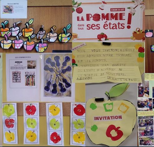Ce projet, démarré lors de la semaine du goût avec des dégustations de pommes et des recettes différentes chaque jour, s’est poursuivi bien au-delà, en découvrant différents artistes en arts visuels, des réalisations en deux et trois dimensions, un travail sur le pommier et les variétés de pommes. Une exposition à destination des camarades de l’école et des familles a finalisé le projet : chaque classe a reçu son invitation, portée par un groupe d’élèves de PS-GS ! Familles et copains ont beaucoup apprécié, les élèves de PS-GS ont ainsi pu expérimenter toutes les étapes d’un riche projet et récolter les satisfactions de sa mise en œuvre !