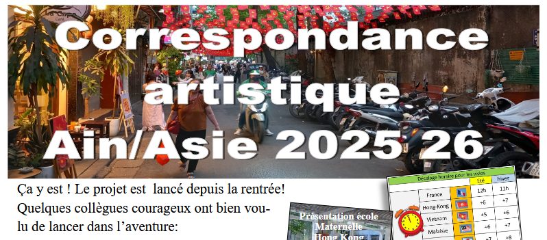 Une correspondance artistique entre des classes de l’Asie (en lycées ou écoles français) et des écoles de l’Ain, tous cycles confondus. Des collègues de Briord, Drom, Lagnieu, Montmerle, Oyonnax, St Jean de Gonville, Villebois… correspondent désormais avec des classes de 4 pays de la zone Asie. En savoir plus